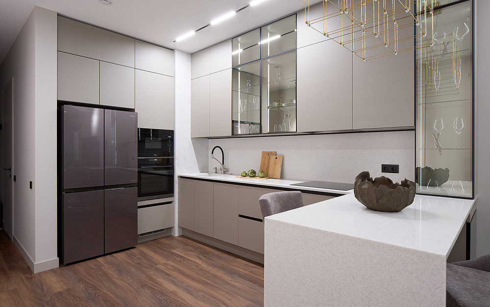 С островом — для просторных кухонь. Дополнительный рабочий центр с местом для техники и хранения. Может служить зоной для перекусов. Придаёт интерьеру современный вид.