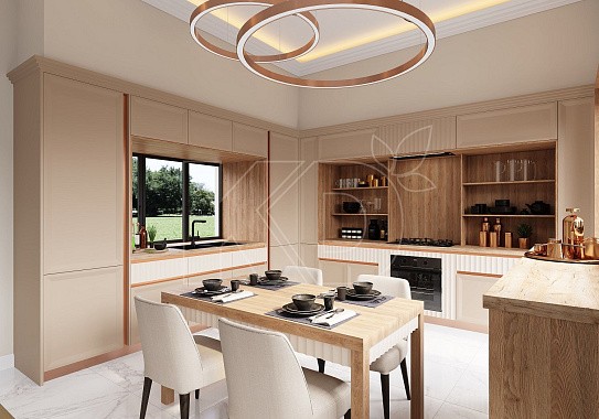 • Дизайн кухни в бежевых тонах придает помещению теплоту, если оно располагается на северной стороне, прекрасно компенсируя недостаток света;