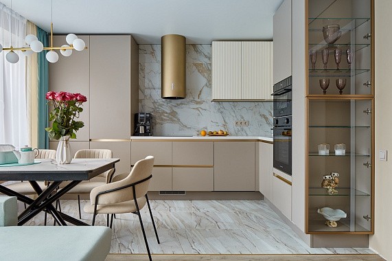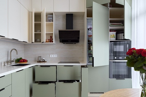 Высота полок внутри шкафов напрямую влияет на удобство хранения. Стандартом считается 25–30 см — этого достаточно для большинства тарелок и банок. Но если семья активно использует высокую кухонную утварь, кастрюли или бытовую технику, дизайнер всегда может подобрать правильные размеры кухни, изменив этот показатель. Таким образом, каждая полка становится функциональной и соответствует привычкам семьи.