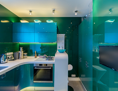 Эффектная кухня для Вас – это футуристическая кухня? Тогда цвет «хамелеон» может Вас заинтересовать. Это особая разработка итальянской бренда «Renner», которая наделяет кухонные фасады уникальными свойствами. Точная формула «Хамелеона» держится в секрете. Известно лишь, что в него добавляют металлическую пудру. Будучи нанесённым на кухонные фасады, этот лак меняет свой цвет в зависимости от угла, под которым Вы смотрите на свою кухню!