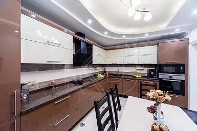 - Широкий ассортимент. Модели в коричневых тонах могут быть линейными, островными, П-образными, угловыми, полуостровными.