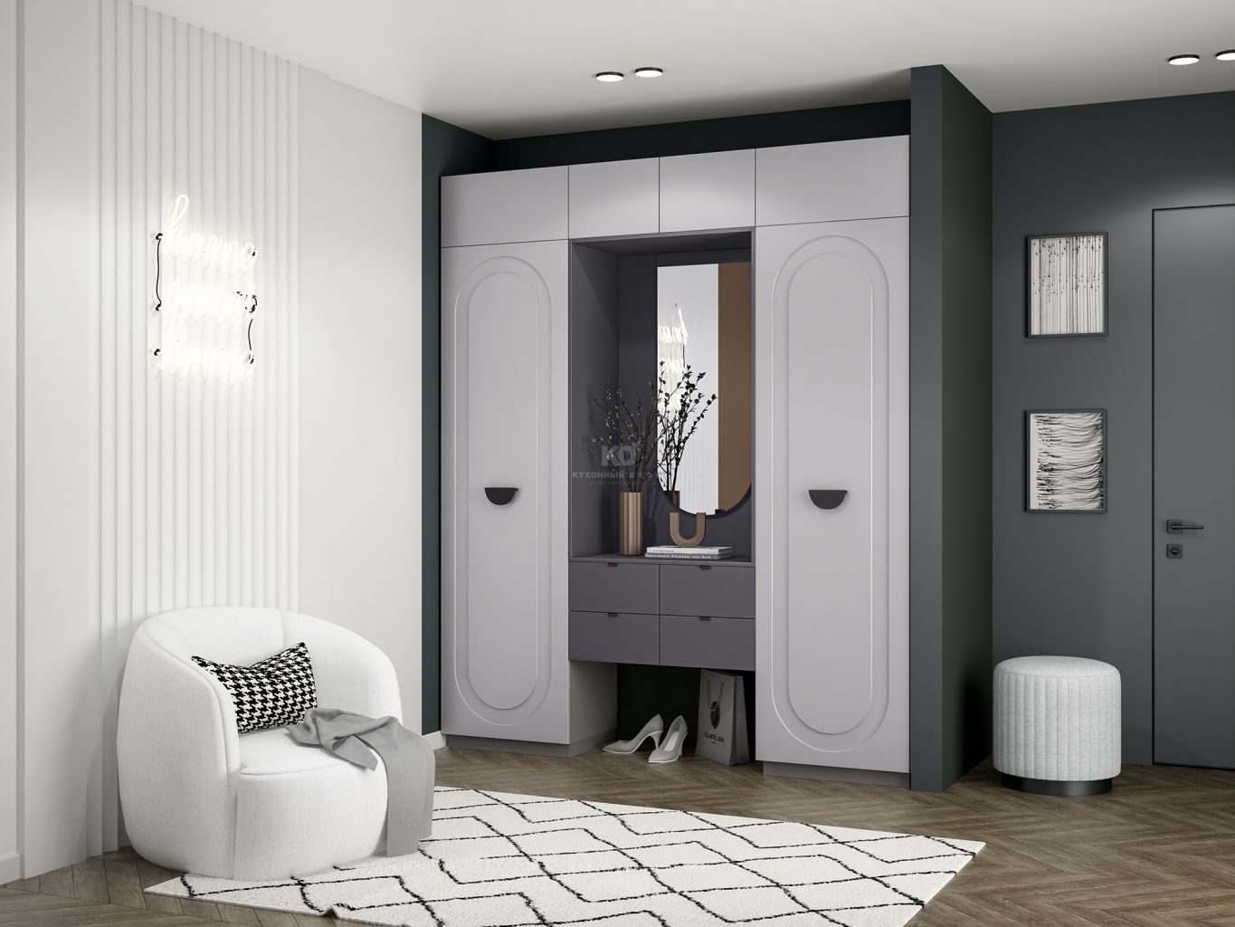 Прихожая Арко — приветствие вашего дома в фирменной эстетике линейки Арко. Два стройных пенала образуют архитектурную раму, а между ними — симметричная парящая тумба на четыре вместительных ящика.