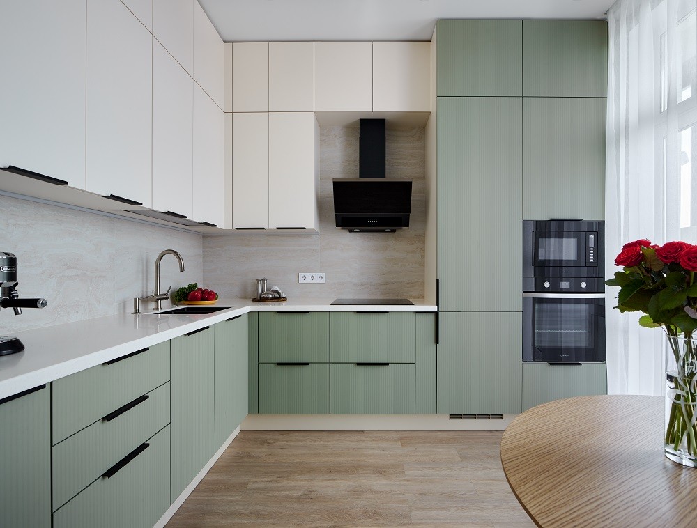 Фасады с эффектом плиссировки прекрасно чувствуют себя рядом с однотонными поверхностями. Нежный оливковый в паре с белым создаёт интересный, «незаезженный» контраст. Кухня выглядит солидно и, вместе с тем, невероятно «воздушно». Это при том, что гарнитур имеет внушительную высоту, будучи выполненным «под потолок»!